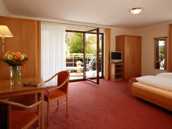 Entdecken Sie unser einladendes, zentrumsnah und ruhig gelegenes Hotel und tauchen Sie in den Ort ein, der Ihnen Entspannung und Erholung verspricht. Unser Wellnessbereich mit Sauna und Bio-Sauna lässt Sie das Wohlfühlen ganzkörperlich verspüren. Unsere Terrasse bietet mit großer Liegewiese im sonnigen Garten eine gute Gelegenheit zum rundum Erholen an. Wählen Sie unsere barrierefreien EZ/DZ, die teilweise einen Balkon oder Terrassenzugang haben. Für Selbstversorger stehen unsere Appartements (Miniküche) zur Verfügung. Als nikotin-, koffein- und alkoholfreies Haus haben wir uns auf eine gesunde, vegetarische Kost spezialisiert. Zu unserem Angebot gehört auch der kostenlose WLAN- Zugang. Auch für Tagungen und Familienfeste sind unsere 3 Konferenzräume sehr gefragt. All dies erhalten Sie bei einem großen Freizeitangebot in schönster Natur.
