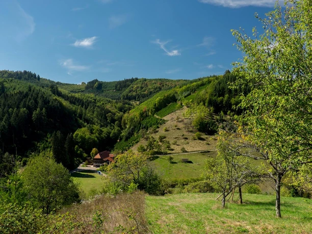 Stattliche Schwarzwaldhöfe mit teils jahrhundertelanger Familiengeschichte, dunkle Wälder, saftig grüne Streuobstwiesen und tief eingeschnittene Täler – Schwarzwälder Postkartenidylle pur! Aber doch nicht im Weinort Durbach?