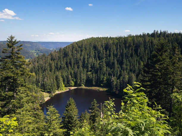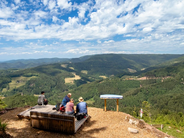 Die zweite Etappe steht ganz im Zeichen des Genusses. Über steinige Pfade führt der Sinfoniesteig von der Alexanderschanze über ein Teilstück des berühmten Westweges. Hier, am Rande des Nationalparks Schwarzwald, hat die Natur einen ganz besonderen Zauber. Wir erreichen das Natur- und Sporthotel Zuflucht auf fast 1000 Metern Höhe. Wie wäre es mit einer Kaffeepause? Entspannt wandern wir danach Richtung Buchkopfturm, wo wir eine schöne Aussicht auf das Renchtal genießen. Auf dem Renchtalsteig wandern wir weiter bis zur Renchtalhütte. Die urige Hütte lädt mit ihrer großen Sonnenterrasse zu einem genussvollen Zwischenstopp ein. Wer die Einfachheit eines Picknicks bevorzugt, auf den wartet ein kleines Stück weiter der Martinshof mit seinem Regiomat. Lokale Leckereien vom Bergkäse bis zum Schwarzwälder Schinken gibt es hier direkt aus dem Automaten. Mit kühlen Getränken lässt es sich im anliegenden Garten herrlich rasten. Wer Lust hat kann, nach vorheriger Absprache, in der hauseigenen Whisky Destille Brandhaus7 einen guten Whisky probieren. Ein kurzes Stück überqueren wir nun die Fahrstraße, vorbei am Hotel Breitenberg und dem Damwildgehege, bevor es wieder in den Wald hinein geht. Lichten Mischwälder folgend trifft der Sinfoniesteig am Holderstanzenhof auf den Schwarzwaldsteig. Hier, an der Peterstaler Mineralwasserstation, locken gut gekühlte Getränke, hauseigener Schnaps und Honig zu einem Zwischenstopp. Stetig bergab wandern wir durch schattige Wälder, mal auf breiten Forstwegen, mal auf herausfordernden Pfaden. Relaxen kann man noch einmal oberhalb des Bästenbachtals auf der gemütlichen Himmelsliege mit traumhaften Blick auf Bad Peterstal. Saftige Wiesen begleiten uns nun hinab durchs Bästenbachtal bevor wir wieder in den Wald eintauchen. Immer wieder schweift der Blick hinunter nach Bad Peterstal und auf die umliegenden Berge. Buchen und Kastanien begleiten uns zurück zum Ausgangspunkt.